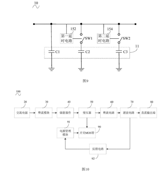 啟動電路10、電容電路11、調節器件12、控制電路13、微控制單元14、第一延時電路152、第二延時電路154、交流電源20、整流模塊30、儲能器件40、變壓器50、整流電路60、濾波