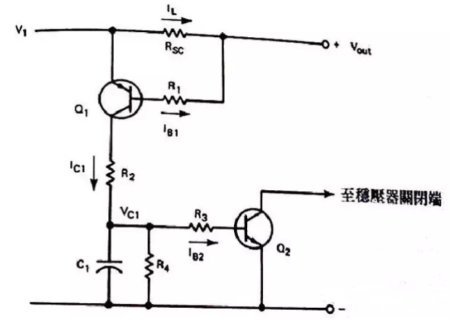工作原理是:在正常的工作情況下,流入到Rsc上的Il不會產生很大的壓降,那么就不會使Q1導通,若負載電流足夠大就會在Rsc上產生電壓,使Q1導通。若Q1在OFF裝態時,而且Ic1=0時C1會全部放電掉,因此Q2也會處于OFF狀態,如果Il電流逐漸增加時,則Il*Rsc=VbeQ1+Ib1R1,此時會集電極會有電流Ic1流過,并有下面的時間常數將C1充電T=R2*C1,那么C1上的電壓是:Vc1=Ib2R3+VbeQ2,為了使為了使電容器電壓的負載效應減到最低值,我們可選用具有較高的HFE的達林凳管子來代替Q2,這樣可以把基極電流限制在微安培,我門在選擇電阻R4時要遠遠大于R3。這樣當電流過載時,C1電容會快速放電。