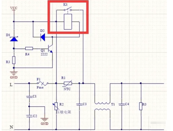 開關電源中初期階段繼電器是斷開的。當VCC逐漸達到自身電壓的時候,穩壓二極管D1導通,三極管Q1打開,繼電器K1閉合,相當于把限流NTC熱敏電阻R1短路。