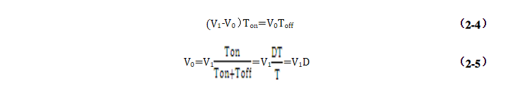 現在來講講開關電源的電路工作原理:Boost電路即升壓電路,當Q1導通時,能量從輸入電源流入儲存于電感L1中,此刻二極管D1反偏,負載由濾波電容C1供給能量,將C1中儲存的電能(C1V02/2)釋放給負載R1。當Q1截止時,電感L1中電流不能突變,此刻二極管D1導通,電感中儲存的能量(L1I2/2)經二極管D1,流入電容C1,并供給負載R1。依據電感的伏秒平衡,在一個周期內電感的伏秒乘積和為零。如果Q1導通時間Ton越大,那么Q1截止時提供給負載的電壓就會越大。下面通過具體的計算來加深了解:根據伏秒平衡有式(2-2)、(2-3)