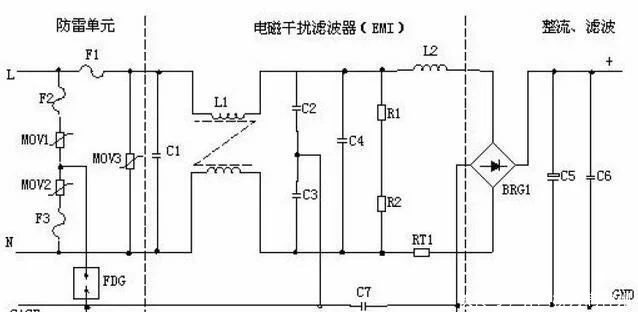 ②輸入濾波電路:C1、L1、C2、C3組成的雙π型濾波網(wǎng)絡(luò)主要是對(duì)輸入電源的電磁噪聲及雜波信號(hào)進(jìn)行抑制,防止對(duì)電源干擾,同時(shí)也防止電源本身產(chǎn)生的高頻雜波對(duì)電網(wǎng)干擾。當(dāng)電源開啟瞬間,要對(duì)C5充電,由于瞬間電流大,加RT1(熱敏電阻)就能有效的防止浪涌電流。因瞬時(shí)能量全消耗在RT1電阻上,一定時(shí)間后溫度升高后RT1阻值減小(RT1是負(fù)溫系數(shù)元件),這時(shí)它消耗的能量非常小,后級(jí)電路可正常工作。