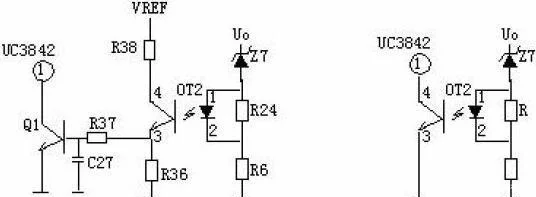 輸出限壓保護(hù)電路:輸出限壓保護(hù)電路如下圖,當(dāng)輸出電壓升高,穩(wěn)壓管導(dǎo)通光耦導(dǎo)通,Q1基極有驅(qū)動(dòng)電壓而道通,UC3842③電壓升高,輸出降低,穩(wěn)壓管不導(dǎo)通,UC3842③電壓降低,輸出電壓升高。周而復(fù)始,輸出電壓將穩(wěn)定在一范圍內(nèi)(取決于穩(wěn)壓管的穩(wěn)壓值)。