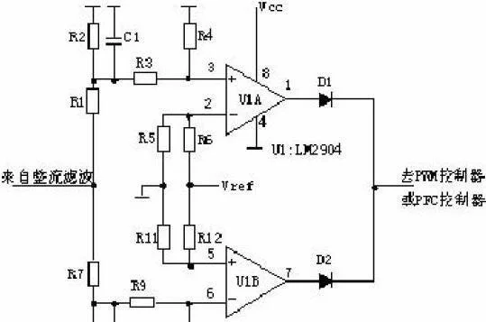 AC輸入和DC輸入的開關(guān)電源的輸入過(guò)欠壓保護(hù)原理大致相同。保護(hù)電路的取樣電壓均來(lái)自輸入濾波后的電壓。取樣電壓分為兩路,一路經(jīng)R1、R2、R3、R4分壓后輸入比較器3腳,如取樣電壓高于2腳基準(zhǔn)電壓,比較器1腳輸出高電平去控制主控制器使其關(guān)斷,電源無(wú)輸出。另一路經(jīng)R7、R8、R9、R10分壓后輸入比較器6腳,如取樣電壓低于5腳基準(zhǔn)電壓,比較器7腳輸出高電平去控制主控制器使其關(guān)斷,電源無(wú)輸出。