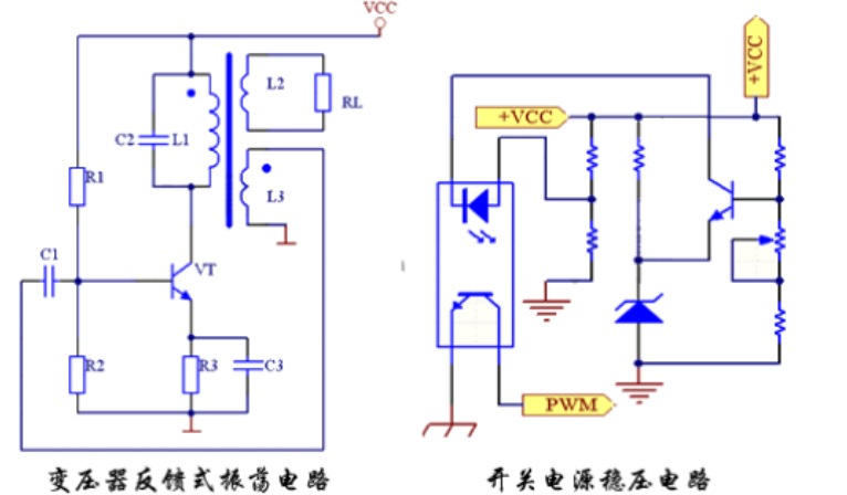 在談開關電源之前,先了解一下變壓器反應式振動電路,能發生有規律的脈沖電流或電壓的電路叫振動電路,變壓器反應式振動電路便是能滿足這種條件的電路;它由基本放大電路與一個反應回路組成,其間 C2、Ll組成一個并聯諧振選頻電路,在電路通電的瞬間VT 導通,此時在C2、Ll組成的并聯諧振電路上發生非常豐富的諧波,當外加頻率和并聯諧振電路的固有頻率相等時,電路進入振動狀態,并經過L3反應到VT的基極進一步放大,終究構成有規律的脈沖電流或電壓輸出到負載RL上。開關電源便是環繞變壓器反應式振動電路而設計,只不過在原來的基礎上增加了一些保護和操控電路,咱們能夠用剖析振動電路的辦法來剖析開關電源。