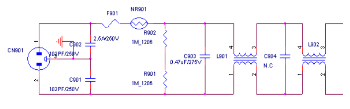 c901C902為共模電容,首要按捺差模干擾,即前方和零線別離與地之間的干擾。電容值愈大對低頻干擾按捺作用愈好,在這里選用102PF/250V