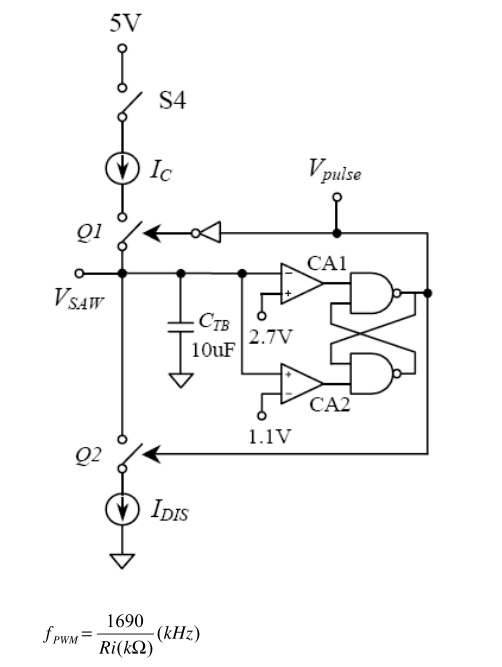 IC內部放置電容CTB的充放電産生振蕩波形,其上下限般定在2.7V輿1.1V,如三所示。常踞振蕩電VSAW大於2.7V,比較器CA1的翰出凹凸羋位,Vpulse高高維位Ql截止。比較器CA2的翰出高高譙位,Q2尊通,CTB放電。營VSAW小於1.1VCA2的翰出凹凸隼位,CA1的翰出剎高隼位,Vpulse凹凸維位,Ql通,Q2截止,CTB充電。藉由外加電阻RI輿參考電厘VR能夠産生一倜參電流IR,而踞茜波的充電電流是IC內部很小的電流: