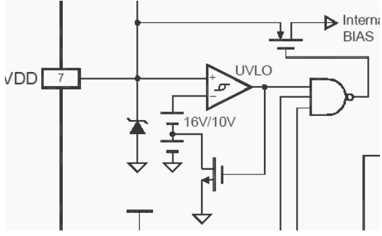 SG6841采用了欠壓鎖定比較器來確保輸出級被驅動之前,集成電路已完全可用。欠壓鎖定回路其實質是一個滯回比較器,以防止在通過它們各自的門限時產生過錯的輸出動作。它的開啟電壓為16V,關閉電壓為10V。在啟動過程中,比較器反向輸入端為16V,當VDD<16V時,比較器輸出為低電平,SG6841無法工作。當VDD升到16V時,欠壓鎖定器輸出為高電平,SG6841正常工作,同時MOS管導通,使比較器反向輸入端為10V。當VDD下降至10V欠壓鎖定器的輸出回到低電平整個電路停止工作.SG68417腳端設置了一個32V的齊納二極管,確保內部電路肯定工作在32V以下,以防電壓過高損壞芯片。
