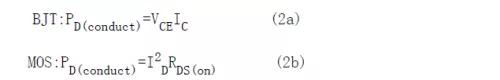 控制這個損耗的典型方法是使功率開關導通期間的電壓降最小。要達到這個目的,設計者必須使開關工作在飽和狀態。這些條件由式(2a)和式(2b)給出,通過基極或柵極過電流驅動,確保由外部元器件而不是功率開關本身對集電極或漏極電流進行控制。