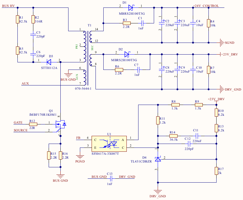 假設輔助開關電源SPS采用了經典的單管反激變換器,如圖5所示,SPS從變頻器的BUS電容上取電,這里為了簡化電路,變壓器T1的輸出只設計了兩路輸出電壓,分別給IGBT的驅動器和MCU側供電,從前面的定義可以看出,給MCU供電的+24V_CONTROL就是SELV電路,需要與其他電路之間做加強絕緣處理,也就是變壓器T1pin12-pin14所在的繞組與其余繞組之間必須滿足加強絕緣要求,同時,在PCB板上,+24V_CONTROL所在電路與其他電路之間的爬電距離也必須滿足加強絕緣要求。