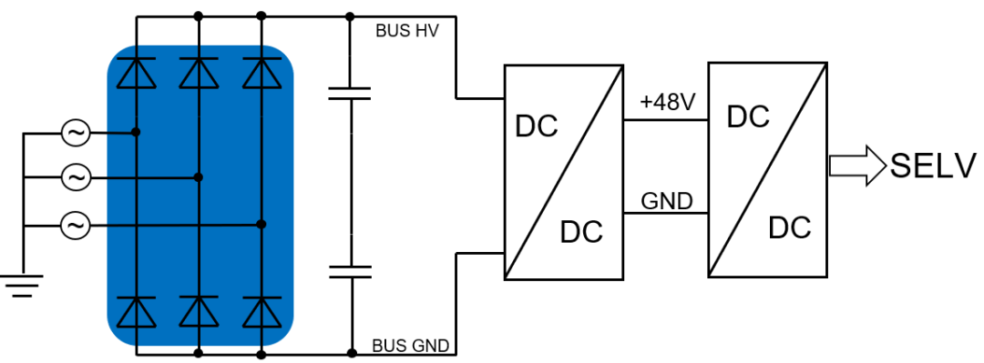 開關電源整機降成本帶來的附贈產物,如圖8所示,以前傳統的給SELV電路供電是采用兩級變換器的方式,先通過一級DC-DC變換器將BUS母線降低為48V或者更低,再通過一級隔離DC-DC變換器給SELV電路供電,因為第二級隔離DC-DC變換器之間的壓差不可能超過750V閾值,所以,局部放電測試就無需再做,只需要滿足對應的加強絕緣要求即可。