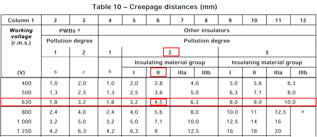 3、增加氣隙長度和爬電距離,以降低電場強度。以圖7中測得的UPD電壓有效值559Vrms去查詢對應的加強絕緣爬電距離要求,如圖14所示,在污染等級為類,采用600>CTI≥400的絕緣材料的條件下,基本絕緣的爬電距離要求為4.5mm,則滿足加強絕緣要求的爬電距離至少為基本絕緣爬電距離要求的2倍,也就是要大于9mm