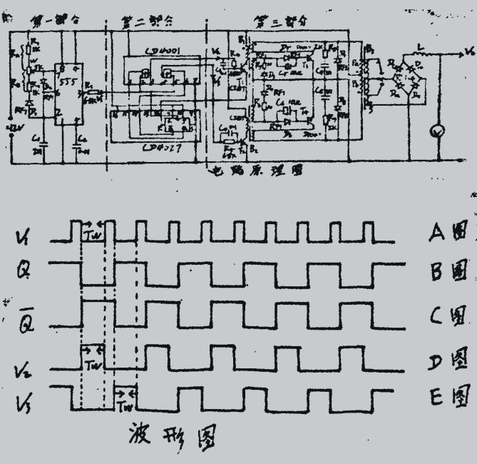 第二部分:這部分是由JK觸發(fā)器CD4027(只用一個y和四個輸入或非門CD4001(只用2個)組成。這部分電路完成脈沖信號的邏輯關系。V作為K觸發(fā)器的時鐘信號。每當時鐘信號的下降沿到來時,JK觸發(fā)器的Q端和Q端電平都將發(fā)生反轉,如圖B和圖C。因為或非門的2角和5角信號為V,1角信號為Q.6角信號為Q,我們知道或非門只有輸人端同時為低電平時.輸出才為高電平。所以3角輸出波形V如圖D.4角輸出波形V,如圖E,它們的脈沖寬度為Tw。