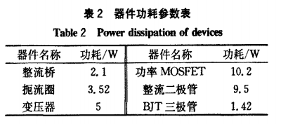 3)功耗參數:本例電源系統的主要發熱元件共有16個,電路中主要發熱器件各接觸面的損耗可由(4)式求得,其中變壓器的損耗可分別由文獻[3]中的銅損及鐵損的計算公式分別求得。本例中將計算得到的各個主要發熱元器件的功率損耗值,按照參數類型歸類整理,如表2所示。