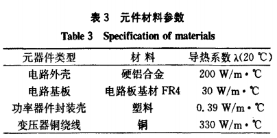 材料參數:該電路中涉及的材料包括鋁合金、銅、塑料和電路基板材料-FR4。表3為元器件材料的主要參數。