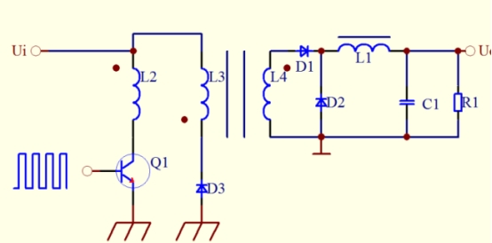 這種開關(guān)電源電路,輸出功率較大(不管Q1導(dǎo)通與截止,都有能量傳遞到負載上)―可是存在問題是:變壓器結(jié)構(gòu)凌亂,體積較大,所以其實踐運用很少。