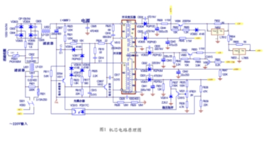 機(jī)芯的開關(guān)電源具有結(jié)構(gòu)簡略,經(jīng)濟(jì)實(shí)用等特點(diǎn),是彩色電視機(jī)用得最多的一種開關(guān)電源,廣泛用于新式數(shù)碼彩電中。目前康佳、長虹、海信、廈華等品牌彩電,均有許多機(jī)型使用了這一電源。本文以A25機(jī)芯為例,來分析這種開關(guān)電源的作業(yè)進(jìn)程及檢修方法,具體電路見圖1。