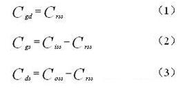 帶外接電容C2的N型MOS管極間電容等效電路MOS管的極間電容柵漏電容Cgd、柵源電容Cgs、漏源電容Cds可以由公式確定,公式中MOS管的反應電容Crss,輸入電容Ciss和輸出電容Coss的數值在MOS管的產品技術手冊上可以查到。公式如下: