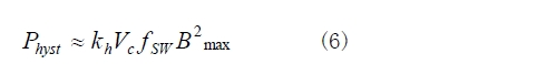 磁滯損耗與繞組的匝數和驅動方式有關。它決議了每個作業周期在B-H曲線內掃過的面積。掃過的面積便是磁場力所作的功,磁場力使磁心內的磁疇重新排列,掃過的面積越大,磁滯損耗就越大。該損耗由式(6)給出。