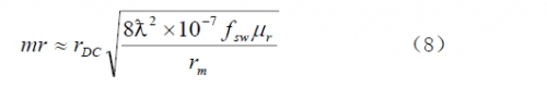 電阻損耗是變壓器或電感內部繞組的電阻產生的損耗。有兩種方式的電阻損耗:直流電阻損耗和集膚效應電阻損耗。直流電阻損耗由繞組導線的電阻與流過的電流有效值二次方的乘積所決議。集膚效應是因為在導線內強溝通電磁場效果下,導線中心的電流被“推向”導線表面而使導線的電阻實踐添加所造成的,電流在更小的截面中活動使導線的有效直徑顯得小了。式(8)給出了這兩個損耗在一個表達式中的計算式。