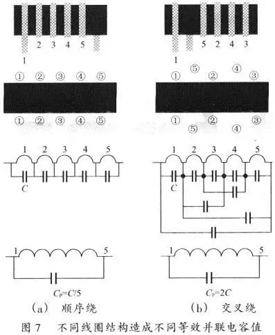 在開關(guān)電源中電感的Cp應(yīng)該控制得越小越好。一起有必要留心到,同一電感量的電感會由于線圈結(jié)構(gòu)不同而產(chǎn)生不同的Cp值。圖7就閃現(xiàn)了同一電感量的電感在二種不同的線圈結(jié)構(gòu)下不同的Cp值。圖7(a)電感的5匝繞組是按次第繞制。這種線圈結(jié)構(gòu)的Cp值是l匝線圈等效并聯(lián)電容值(C)的1/5。圖7(b)電感的5匝繞組是按穿插次第繞制。其間繞組4和5放置在繞組1、2、3之間,而繞組l和5非常靠近。這種線圈結(jié)構(gòu)所產(chǎn)牛的Cp是1匝線圈C值的兩倍。