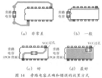 旁路電容(Decouple)的放置也要考慮到它的串聯(lián)電感值。旁路電容有必要是低阻抗和低ESL乩的瓷片電容。但假設(shè)一個(gè)高品質(zhì)瓷片電容在PCB上放置的辦法不對,它的高頻濾波功用也就消失了。圖14閃現(xiàn)了旁路電容正確和差錯(cuò)的放置辦法。