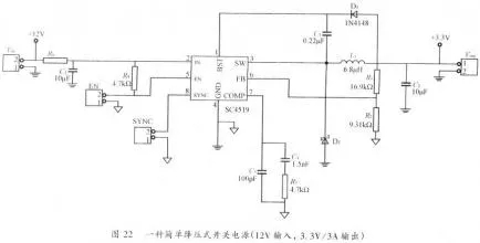 4、開關(guān)電源PCB排版例2圖22是另一種降壓式開關(guān)電源,該電源能使12V輸入電壓轉(zhuǎn)換成3.3V輸出電壓,輸出電流可達(dá)3A。此電源上運(yùn)用了一個(gè)集成電源控制器(Semtech類型SC4519)。這種控制器將一個(gè)功率管集成在電源控制器芯片中。這樣的電源非常簡略,特別適宜應(yīng)用在便攜式DVD機(jī),ADSL,機(jī)頂盒等消費(fèi)類電子產(chǎn)品。