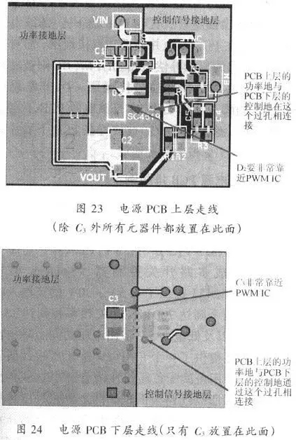 圖23是該電源PCB上層排地圖。為了力便讀者了解,功率接地層和控制信號接地層分別用不同顏色來表明。在這里輸入插座被放置在PCB的上方,而輸出插座被放置在PCB的下方.濾波電感(L1)被放在PCB左邊并靠近功率接地層,而關(guān)于噪音較敏感的反響補(bǔ)償電路(R3,C4,C5)則被放存PCB右邊并靠近控制信號接地層。D2非常靠近SC4519的腳3及腳4。圖24是該電源PCB基層排地圖。輸入濾波電容(C3)被放置在PCB基層并非常靠近SC4519和功率接地層。