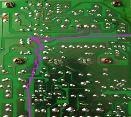 220V交流輸入,通過穩(wěn)妥,負溫度熱敏電阻,安規(guī)電容,共模電感組成的抗電磁干擾電路及過流保護電路,通過整流二極管整流濾波后輸出300V左右的直流電壓。這是電源板正面圖,用紅線畫出的部分為熱地與冷地部分(開關電源接地方式有熱地和冷地之分,與220V電源直接相連的地稱為熱地,人體直接觸摸會觸電;經(jīng)開關變壓器阻隔后,再整流濾波后的地稱為冷地,人體直接觸摸不會觸電)。這是電路板反面圖,在圖中標出開關電源的輸入部分、300V濾波大電容、開關管、開關變壓器、肖特基二極管等首要元器材。