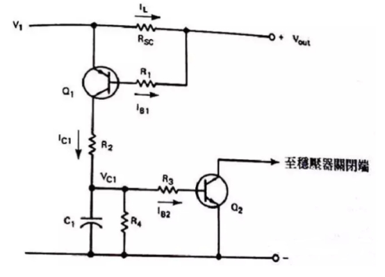 工作原理是:在正常的工作狀況下,流入到Rsc上的Il不會產生很大的壓降,那么就不會使Q1導通,若負載電流足夠大就會在Rsc上產生電壓,使Q1導通。若Q1在OFF裝態時,而且Ic1=0時C1會全部放電掉,因而Q2也會處于OFF狀態,假如Il電流逐步增加時,則Il*Rsc=VbeQ1+Ib1R1,此時會集電極會有電流Ic1流過,并有下面的時間常數將C1充電T=R2*C1,那么C1上的電壓是:Vc1=Ib2R3+VbeQ2,為了使為了使電容器電壓的負載效應減到最低值,我們可選用具有較高的HFE的達林凳管子來替代Q2,這樣能夠把基極電流限制在微安培,我門在選擇電阻R4時要遠遠大于R3。這樣當電流過載時,C1電容會快速放電。