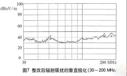 而且為了減少因變壓器側注冊時電流瞬間突變產生的di/dt煩擾,在變壓器T1的 側串進1個電感,以減小器件的注冊損耗,下降輻射煩擾信號。經過整改后,輻射煩擾大大下降,再次對本電源輻射煩擾進行檢驗,完全達到了標準要求,其檢驗效果如圖7所示。